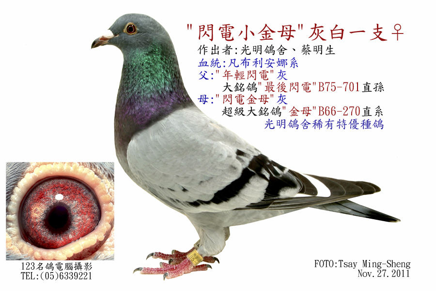 為凡布利安娜"閃電" "金母"系統最可貴的特優遺傳、其父母鴿均無白羽,作出全部主翅、副翼、尾翼、僅一支白羽的仔鴿,機率非常低。
