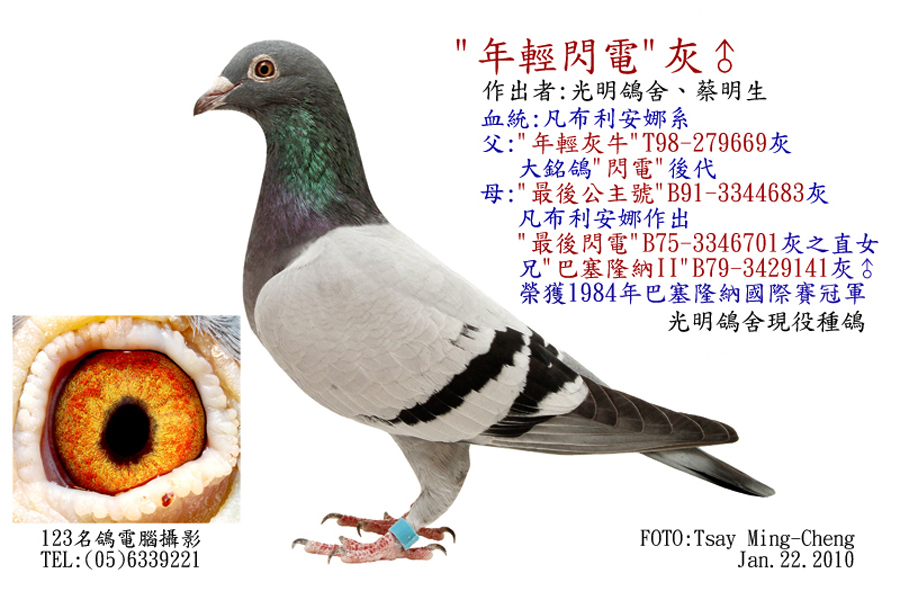 為凡布利安娜"閃電" "金母"系統最可貴的特優遺傳、其父母鴿均無白羽,作出全部主翅、副翼、尾翼、僅一支白羽的仔鴿,機率非常低。