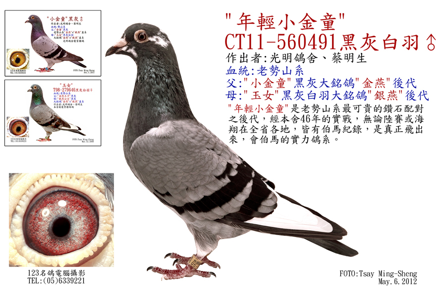父"金勢山"黑灰白羽,是勢山系大銘鴿"金燕"×"銀燕"直系。